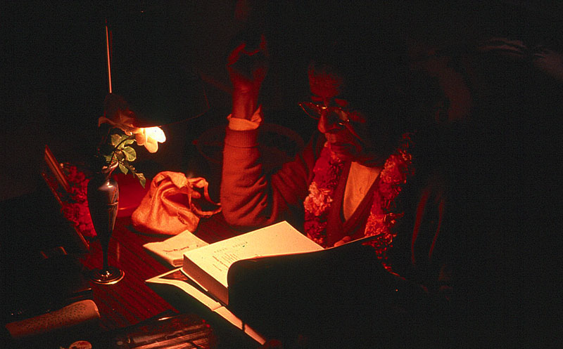 Feeling a bit embarrassed, I stood up and started to leave. But just as I was going out, the guru signaled for me to come over. When I reached his sitting place, he took a sacred thread from an old box and tied it around my right hand. Then he touched a palm-leaf scripture to my head.