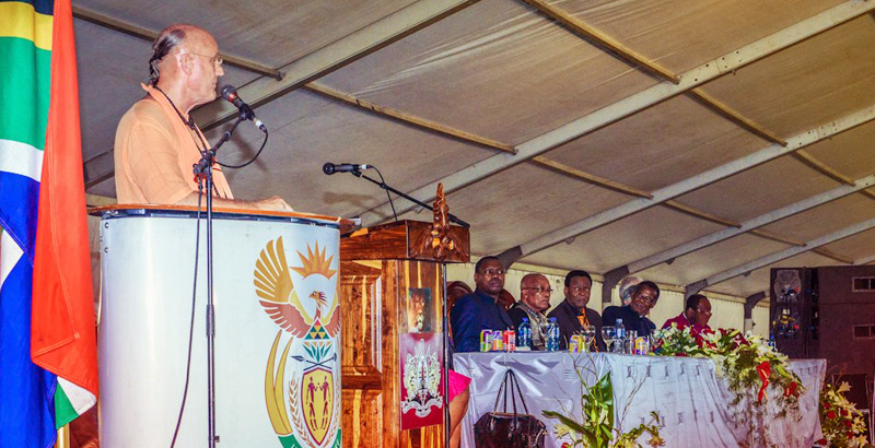 We try to demonstrate this principle in the Hare Krsna movement by propagating the chanting of God’s names in public. One tangible result is that in any number of our centers around the country there are now micro-societies of Africans, whites, coloreds and Indians living together in perfect harmony. We want to share this good fortune with others and we try to do so on a daily basis by breaking down social barriers in a practical way. For example, for the past twenty-four years our movement has distributed tens of millions of plates of hot, nutritious food in low income areas such as the outlying towns and villages of Kwazulu Natal. Our pledge today is to work together with others to achieve nothing short of a “Hunger-Free South Africa.” When the children of this land are fed they can concentrate on their education, and with education comes career and stability. When there is stability in the lives of the citizens there is less crime and violence; people are more likely to treat one another with generosity and to see each other’s commonalities.