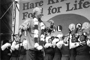 In April 1997 he was once again the temple’s special guest at our Festival for the Children of the Rainbow Nation, held at a large soccer stadium in Durban. It was an extravaganza with eth-nic groups performing, including our devotees who held kirtan. We had invited 50,000 schoolchildren, hundreds of teachers, 50 members of Parliament, the Mayor of Durban, and the King of the Zulus. Devotees distributed lunch packets to each and every child. President Mandela even cancelled the rest of his day’s ap-pointments to stay longer at the program.
