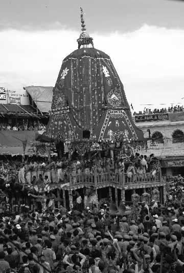 Anticipating huge crowds at the parade, all of us gathered early the next morning in front of the Jagannath Temple. The area ahead of the chariots was cordoned by ropes, and hundreds of policemen and soldiers were busy with security arrangements. I saw army snipers taking their places on the rooftops. There had recently been bombings in Delhi and temples around the country, and I had read warnings in a local paper that morning of possible terrorist attacks during Ratha-yatra.
