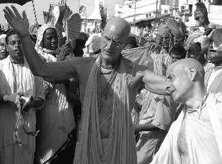 We started kirtan outside the cordoned area while masses of people began to arrive. Soon the broad, three-kilometer road was packed with pilgrims, and it became impossible to move. The temperature had already soared to 48 degrees, and with the high humidity, I was finding it difficult to breathe. I wondered how I could stay for hours in the middle of a crowd estimated at one million. Suddenly I saw Sriman Pandit dasa, an Indian devotee from England, waving to me from inside the cordons.