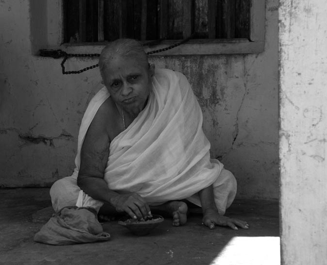As we rounded a corner, we saw an old woman sitting on the porch of her house eating prasadam from a small clay bowl on the ground. She was taking each bite slowly and with deep respect. “That’s a great photo,” I said to Gaura Hari as I took out my camera and photographed her.