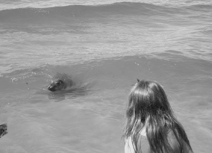 The next day as 150 of us chanted and distributed invita-tions on the beach in Rewel, we were surprised to see our old friend the seal who visits us at least two or three times each summer. As we chanted along the shore it swam along only two meters away, attracting a lot of attention. Suddenly, two life-guards, apparently unaware of the innocent nature of the ani-mal, jumped into the water and began beating it with paddles. The seal quickly swam away.