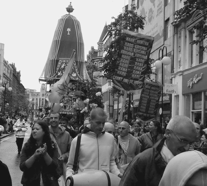 As our colorful procession made its way through the dis-mal atmosphere, a few people began to react. Some stopped to talk to devotees who were handing out invitations to the hall program. At one point I stepped out of the parade myself and walked along the sidewalk. After five minutes a young man in his twenties came up to me.